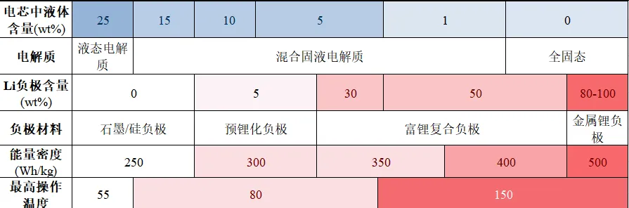 “固態(tài)電池”一般分為半固態(tài)和全固態(tài),對應(yīng)的液體含量分別是5-10wt%、0wt%。固態(tài)電池研究主要以硫化物電解質(zhì)技術(shù)和氧化物電解質(zhì)技術(shù)路線為主,輔以聚合物電解質(zhì)技術(shù)路線,其中寧德時代、蜂巢能源、國軒高科為硫化物電解質(zhì)技術(shù)路線的代表企業(yè),衛(wèi)藍(lán)新能源、清陶能源、輝能科技為氧化物電解質(zhì)技術(shù)路線的代表企業(yè),欣旺達(dá)為聚合物電解質(zhì)技術(shù)路線的代表企業(yè)。