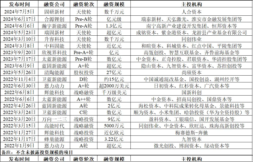 自2022年以來,固態(tài)電池產(chǎn)業(yè)鏈企業(yè)在一級市場備受資本關(guān)注,從融資規(guī)模看,從數(shù)千萬元到超億元,資本市場對該領(lǐng)域充滿信心;從企業(yè)類別看,正極材料(升容科技等)、電解質(zhì)材料(固研新材、中科固能、瑞固新材等)、電池系統(tǒng)(衛(wèi)藍(lán)新能源、清陶能源、蜂巢能源等)等各環(huán)節(jié)齊發(fā)力;從投資方看,除人合資本、成銘資本等知名機(jī)構(gòu)及淮安市金融發(fā)展集團(tuán)、龍游縣產(chǎn)業(yè)基金有限公司等政府投資機(jī)構(gòu),奔馳、廣汽等車企、欣旺達(dá)等電池企業(yè)、小米、華為等產(chǎn)業(yè)投資者也對固態(tài)電池領(lǐng)域注資。