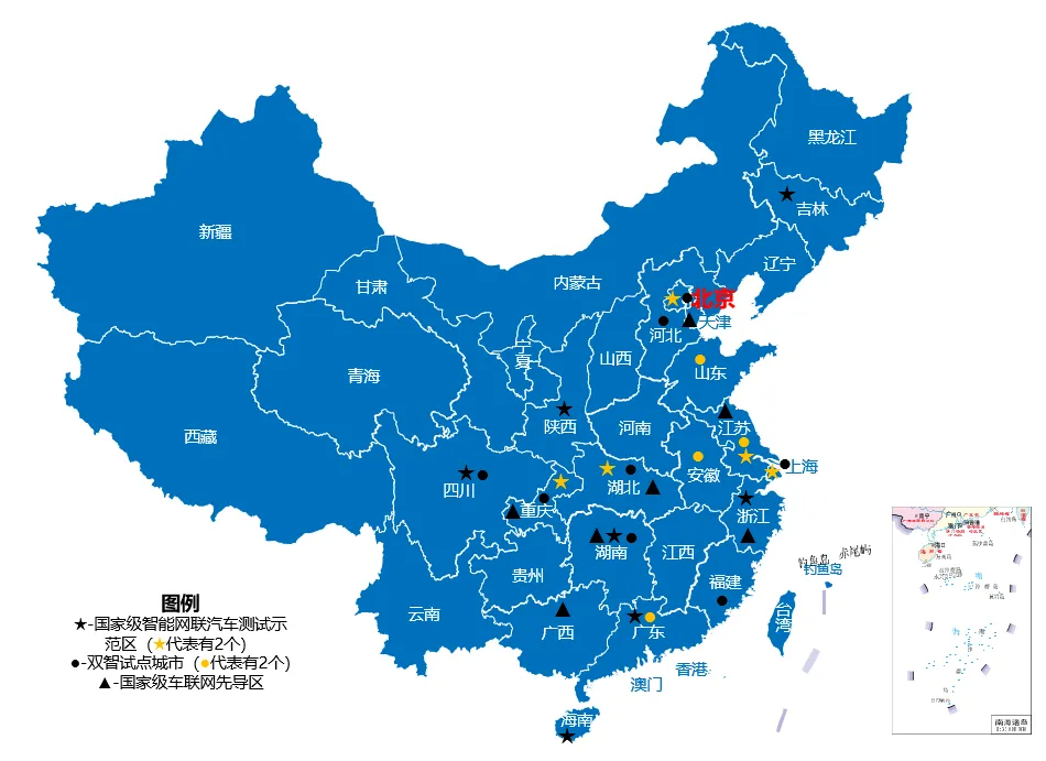 2016年11月,工業和信息化部開始推動構建“基于寬帶移動互聯網的智能汽車與智慧交通應用示范”,北京、上海、浙江、重慶、武漢、吉林獲批建設首批六個示范區。截至2024年5月,全國已有17個國家級智能網聯測試示范區、16個“雙智”試點城市,7個車聯網先導區;全國共開放自動駕駛示范道路3.2萬多公里,測試里程超1.2億公里。