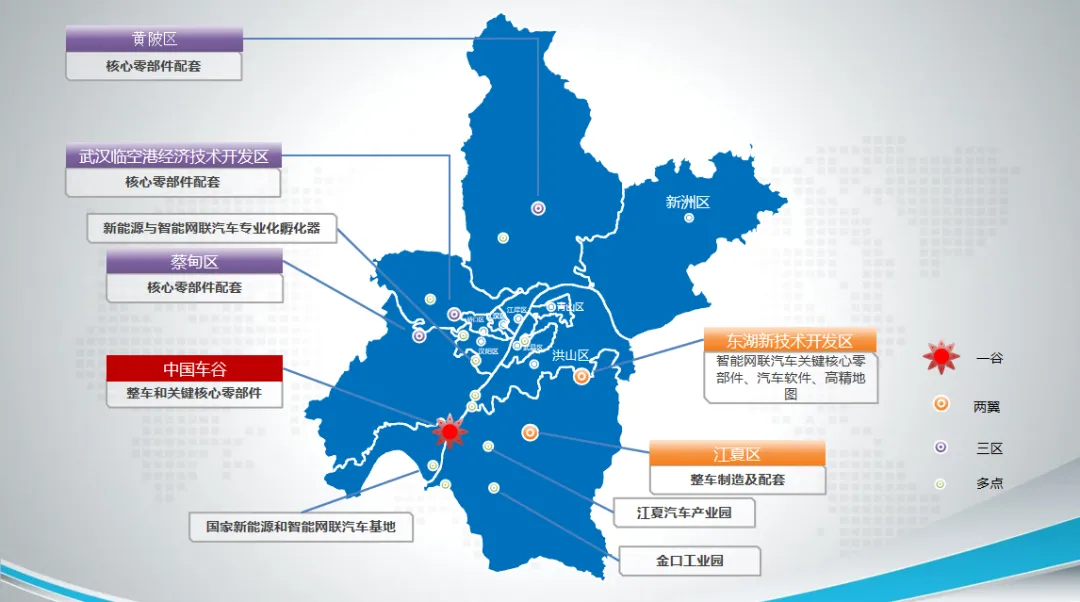 武漢市“一谷兩翼”產(chǎn)業(yè)格局奠定基礎(chǔ),其中經(jīng)開區(qū)“中國車谷”為整車制造及技術(shù)研發(fā)核心,江夏、東湖新技術(shù)開發(fā)區(qū)為關(guān)鍵零部件及配套設(shè)施的動力支撐。重點布局新能源與智能網(wǎng)聯(lián)汽車創(chuàng)新產(chǎn)業(yè)園、車規(guī)級芯片產(chǎn)業(yè)園、光谷智能網(wǎng)聯(lián)汽車軟件產(chǎn)業(yè)園、智能網(wǎng)聯(lián)智造園等重點園區(qū)載體,大力發(fā)展整車制造+三電系統(tǒng)、車規(guī)級芯片、汽車軟件及高精地圖、智能網(wǎng)聯(lián)汽車零部件等產(chǎn)業(yè)。同時聯(lián)動“三區(qū)多點2”,打造臨空港汽車產(chǎn)業(yè)園、中德國際產(chǎn)業(yè)園、新能源汽車十里長廊等一批具有特色功能的重點園區(qū),提升產(chǎn)業(yè)韌性。
