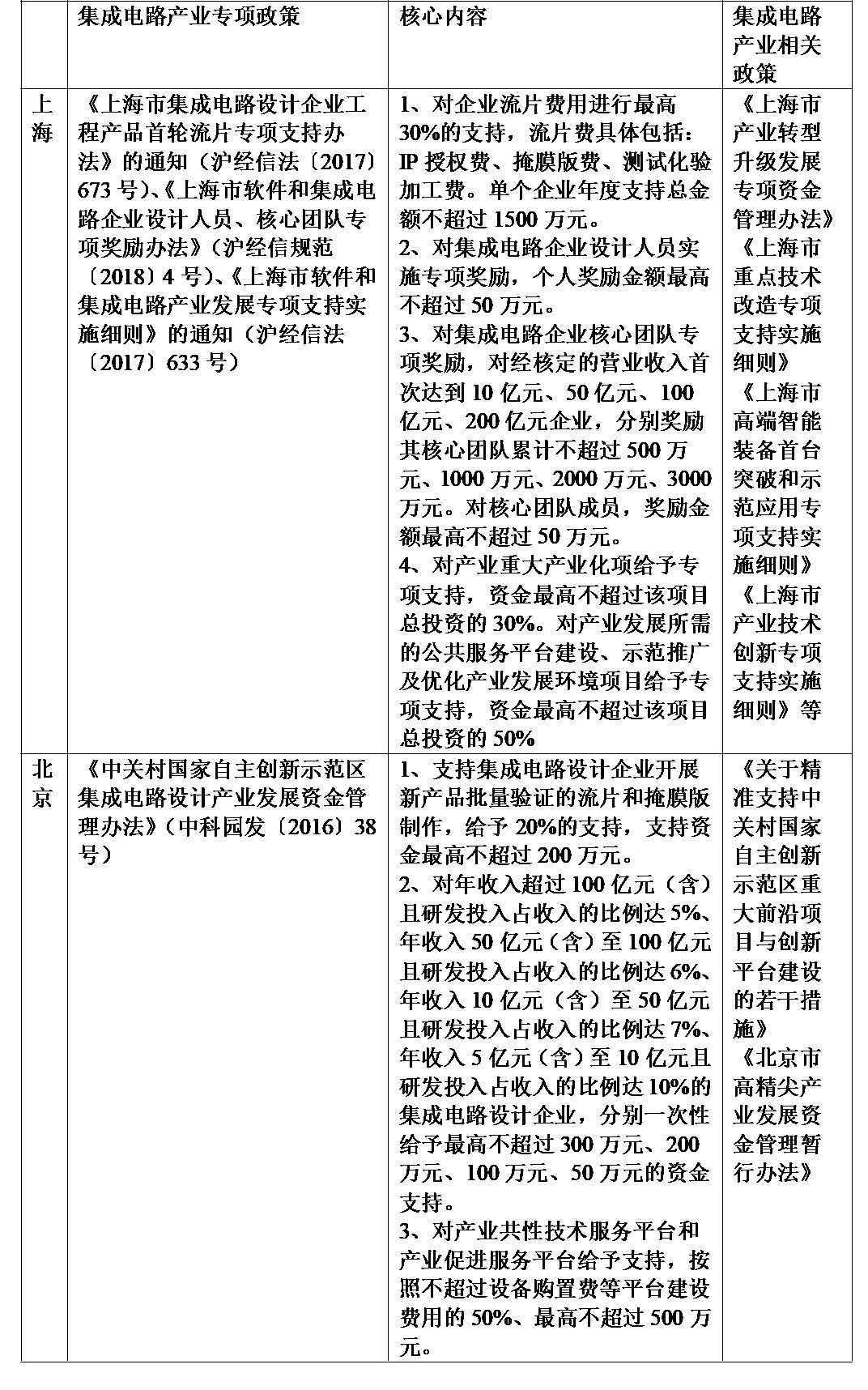 (4)技術產品比較。上海集成電路企業涉及面較多,因而企業產品分布的跨度很大,產品種類繁多。例如芯片設計領域,在無線通信芯片(WIFI、藍牙等)、射頻前端、高性能電源管理芯片、MCU、傳感器、音視頻多媒體芯片、人工智能芯片等領域都活躍著不少企業。上海前十大集成電路設計企業僅占上海設計業總銷售額的40%左右,說明上海集成電路設計業的集中度不高,尤其是近幾年中小集成電路企業創新創業活躍,大量具有高成長潛力的企業不斷在上海涌現。相比之下,北京集成電路的主要產品領域依然是以存儲器設計、嵌入式CPU、智能卡及金融IC、顯示芯片等傳統優勢領域為主,在國內創新創業活躍的產品板塊上鮮少看到北京創業企業參與其中。另外,從解決“卡脖子”產品和關鍵技術領域來看,北京和上海的貢獻相當。如位于北京的中芯北方現為中國內地產能最大的12英寸晶圓代工廠,也是國內最大最領先的國產工藝、設備與材料驗證平臺,為近幾年集成電路核心裝備和材料國產化率的提升提供了巨大支持。而上海中芯南方則在先進工藝上不斷突破,14nm工藝已經量產,改進版的12nm工藝也在導入。此外在EDA工具、光刻膠、大硅片、刻蝕機、PVD等關鍵材料、設備及軟件工具領域,北京和上海也都分別在這些領域承載著國產化突圍的重任。