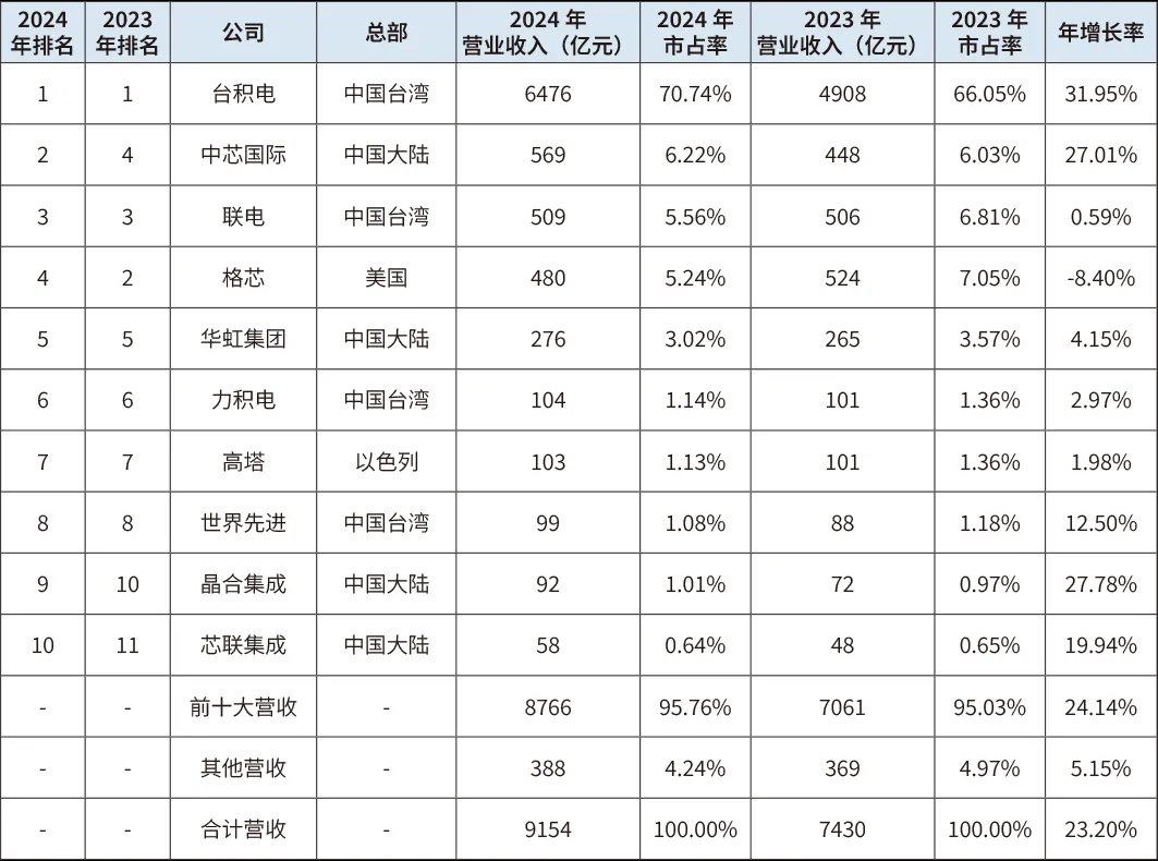 表1 2023年、2024年全球前十大純集成電路制造代工企業(yè)