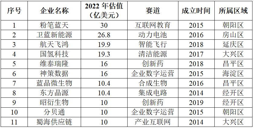 2022年北京新晉11家獨角獸企業(yè),分布于9個賽道。其中,創(chuàng)新藥和企業(yè)數(shù)字運營賽道各新晉2家,互聯(lián)網(wǎng)教育、動力電池、智能飛行、清潔能源、合成生物、集成電路、產(chǎn)業(yè)互聯(lián)網(wǎng)等賽道各新晉1家。從分布區(qū)域來看,大興區(qū)、經(jīng)開區(qū)、朝陽區(qū)、昌平區(qū)等4個區(qū)各新晉2家,海淀區(qū)、房山區(qū)、延慶區(qū)等3個區(qū)各新晉1家。昌平區(qū)維泰瑞隆、經(jīng)開區(qū)昭衍生物2家新晉創(chuàng)新藥獨角獸企業(yè)于近5年成立,昌平區(qū)新晉藍晶微生物獨角獸企業(yè),近幾年北京市醫(yī)藥健康前沿領(lǐng)域發(fā)展較好。