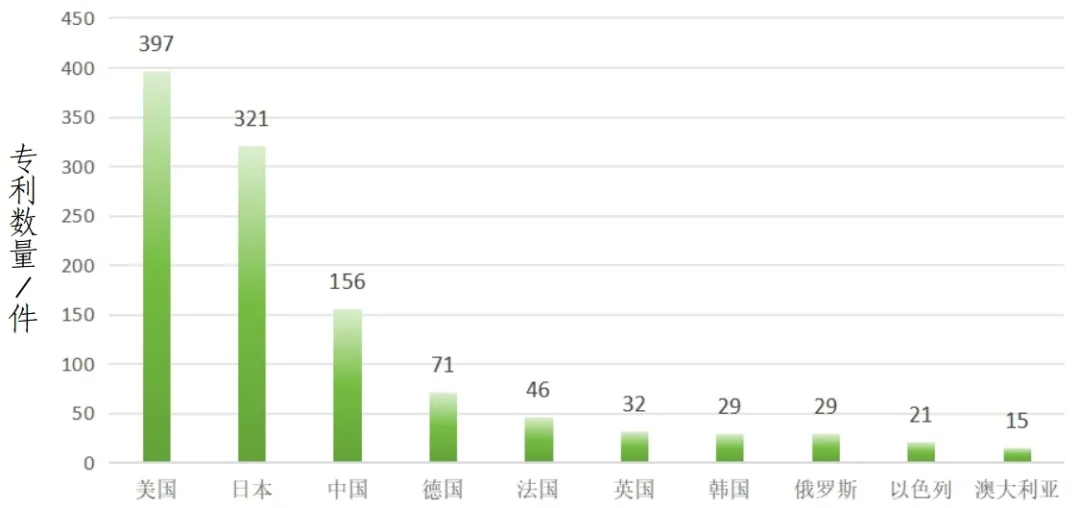 圖2 eVTOL領域PCT申請量排名前十的國家(截止到2024年)