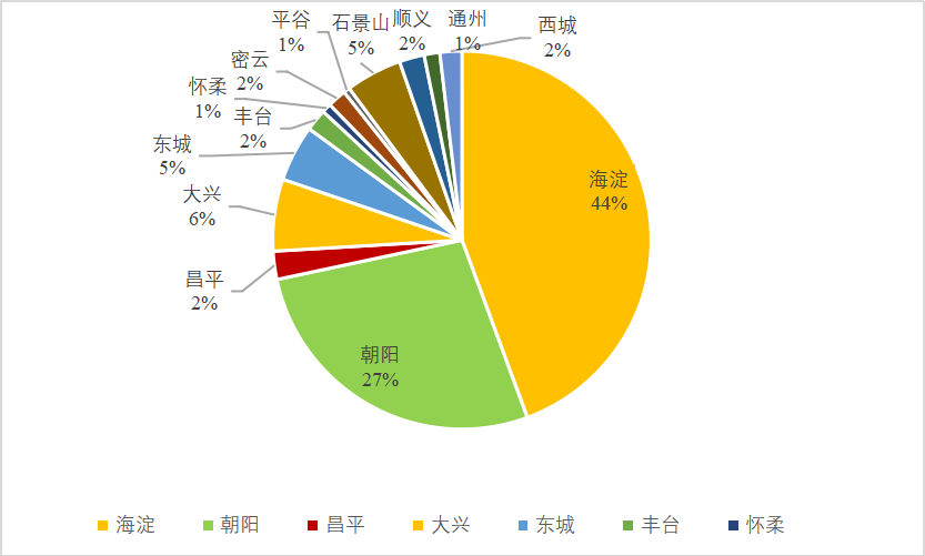 圖1 2019-2022年北京市數字經濟增加值及占GDP比重 (二)創(chuàng)新上成效顯著 北京市高度重視創(chuàng)新,平臺經濟領域的創(chuàng)新投入逐年增長,并形成一批創(chuàng)新成果。一是平臺企業(yè)研發(fā)投入強度加大。2022年北京市平臺企業(yè)研發(fā)投入強度約15%,遠高于全市研發(fā)經費投入強度6%的水平。其中,信息資訊類平臺、社交娛樂類平臺、計算應用類平臺等研發(fā)投入強度超20%。二是平臺企業(yè)在5G、大數據、云操作系統(tǒng)、分布式數據庫、區(qū)塊鏈、智能算法、金融科技等領域積極進行核心關鍵技術研發(fā)并開展前沿技術探索,上線首個超導量子計算云平臺,發(fā)布國內首個自主可控區(qū)塊鏈平臺“長安鏈”。部分領先企業(yè)發(fā)揮“頭雁效應”,參與建設算力等新型基礎設施,推動自主技術規(guī)模化應用。如抖音成立人工智能實驗室,集中研究機器學習、自然語言處理、計算機視覺、人機交互等前沿技術;百度推出云端全功能AI芯片“百度昆侖”及元宇宙產品“希壤”,以VR技術為基礎,為行業(yè)提供云智一體的元宇宙基礎設施平臺。 (三)空間上集聚發(fā)展 統(tǒng)計數據顯示,北京市重點監(jiān)測平臺企業(yè)集聚在海淀區(qū)及朝陽區(qū),兩區(qū)合計占比超七成。從企業(yè)數量看,海淀區(qū)集聚抖音、快手、百度、美團、貝殼、58、愛奇藝、新浪等多家頭部平臺企業(yè),占全部監(jiān)測平臺企業(yè)的44%以上;朝陽區(qū)集聚阿里、美團、58、360等多家頭部互聯(lián)網平臺企業(yè),占全部監(jiān)測平臺企業(yè)的27%以上。此外,大興區(qū)集聚京東、本來生活、小笨鳥跨境平臺等企業(yè),占全部監(jiān)測平臺企業(yè)的6%以上,形成電商企業(yè)集聚發(fā)展帶動產業(yè)的創(chuàng)新格局。從涵蓋領域看,北京平臺經濟主要分布在出行服務、電子商務、生活服務、游戲動漫、信息資訊、教育培訓、金融、科技等領域,基本涵蓋網絡銷售類平臺、生活服務類平臺、社交娛樂類平臺、信息資訊類平臺、金融服務類平臺、計算應用類平臺等六大類型。