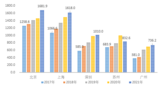 圖1 五城市2017-2021年生物醫(yī)藥工業(yè)產(chǎn)值規(guī)模(億元)