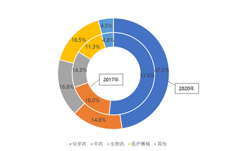 圖2 北京市2017年和2020年生物醫(yī)藥產(chǎn)業(yè)結(jié)構(gòu)