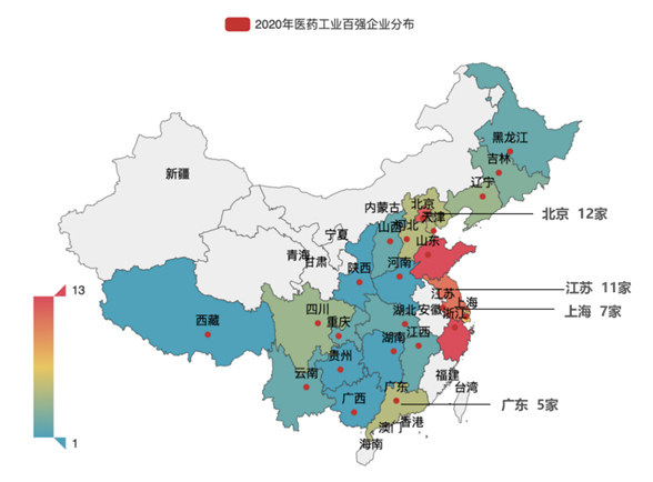圖3 2020年中國醫(yī)藥工業(yè)百強(qiáng)企業(yè)分布熱力圖