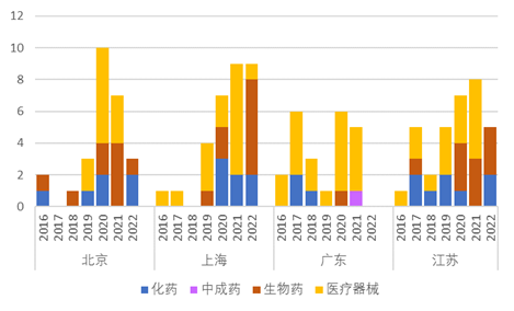 圖4 2016-2022上半年四省市生物醫(yī)藥企業(yè)上市數(shù)量(單位:家)