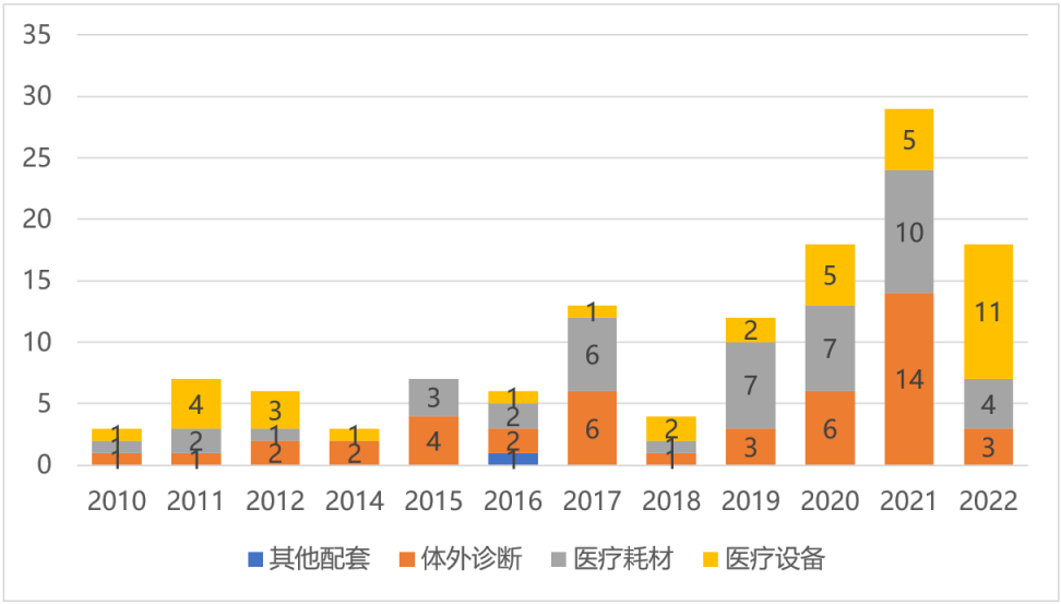 從上市時(shí)間看,近三年高峰涌現(xiàn)。自2011年起,醫(yī)療器械企業(yè)上市活躍度逐漸上升,2020-2022年國內(nèi)醫(yī)療器械行業(yè)迎來上市熱潮,三年間上市企業(yè)合計(jì)數(shù)量占總數(shù)的比重達(dá)到近一半,其中體外診斷企業(yè)上市表現(xiàn)尤為突出,三年合計(jì)上市23家;2022年醫(yī)療設(shè)備類企業(yè)成為上市主力,有11家相關(guān)企業(yè)上市。