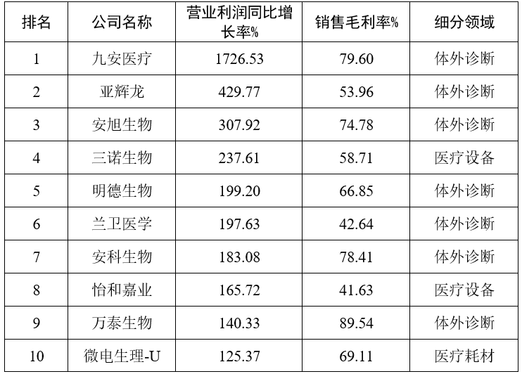 與此同時(shí),行業(yè)毛利率繼續(xù)維持高位,利潤領(lǐng)域分化也愈發(fā)明顯。2022年行業(yè)銷售毛利率達(dá)53.9%,其中體外診斷領(lǐng)域營業(yè)利潤同比增長明顯,行業(yè)前10名中有8家屬于體外診斷領(lǐng)域。