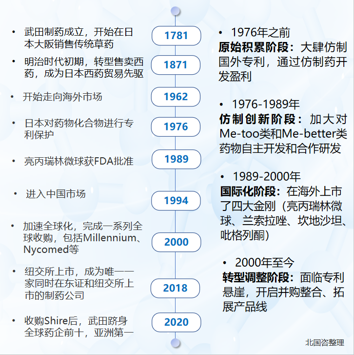 作為“以仿養創”的國際化典范,武田制藥的發展歷程經歷了“普藥→仿制藥→仿創藥→創新藥”四個階段。其最開始只進行普藥銷售,在日本對藥物化合物進行專利保護,且嚴格區分新藥和仿制藥的價格差距后,武田加大對Me-too類和Me-better類藥物的自主開發和合作研發。1980-2000年,其研發上市了仿創藥四大重磅產品(亮丙瑞林微球、蘭索拉唑、坎地沙坦、吡格列酮),為其創收了大量的原始資本。之后,武田重磅藥物專利到期,First-in-class(首創藥物)研發又收效甚微。因此,武田選擇通過外延式并購創新藥企業,獲得產品專利,進行創新轉型。