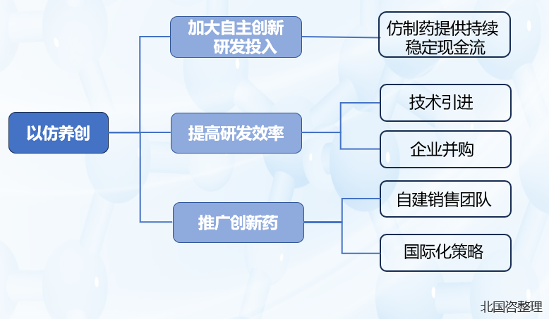 “以仿養創”是指仿制藥企業通過仿制藥打開市場,依托仿制藥端持續、穩定的現金流,為高投入、長周期的創新藥研發不斷造血,經歷了仿制藥研發、仿創結合、自主創新的發展路徑,最終實現創新藥成功上市,幫助企業完成轉型。卷首語: