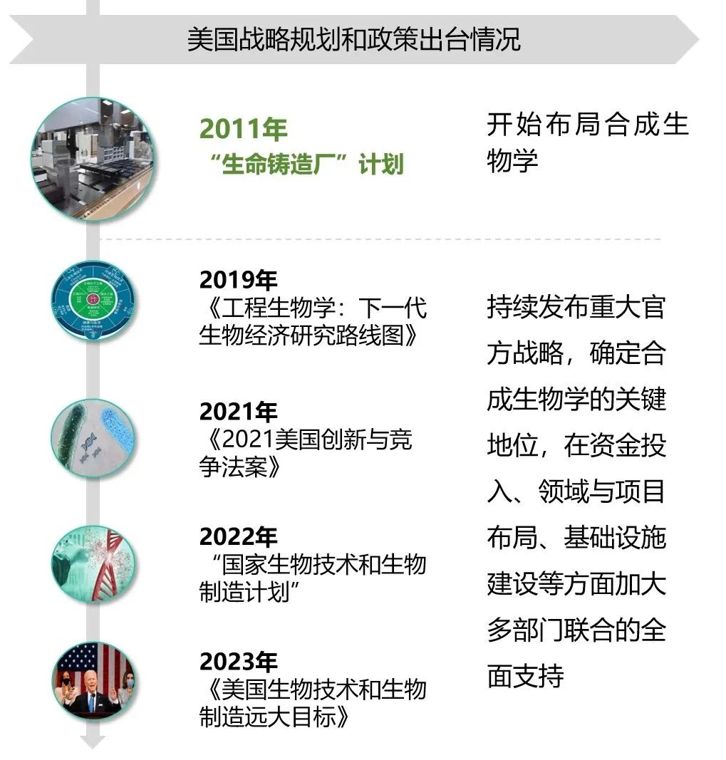 為保持生物技術在未來幾十年內的領先地位,增強生物經濟競爭力,美國持續加大合成生物學在醫藥健康、食品農業、能源環境、材料化工等領域的技術創新與應用布局。自2011年起,先后發布眾多戰略支持,積極推進合成生物學的創新發展。
