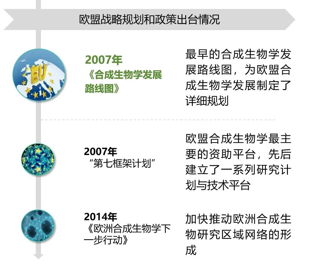 歐盟最早制定了合成生物學發展路線圖,并在“第六框架計劃”(2005年)內正式啟動合成生物學研究。為加快促進合成生物學的市場化應用,開發新的生物基產品,建立循環和可持續的生物經濟,歐盟聚焦生物醫藥、清潔、食品和環境保護等重點領域,陸續發布相關支持計劃與行動,支持以合成生物學來促進歐洲向循環生物經濟轉型。