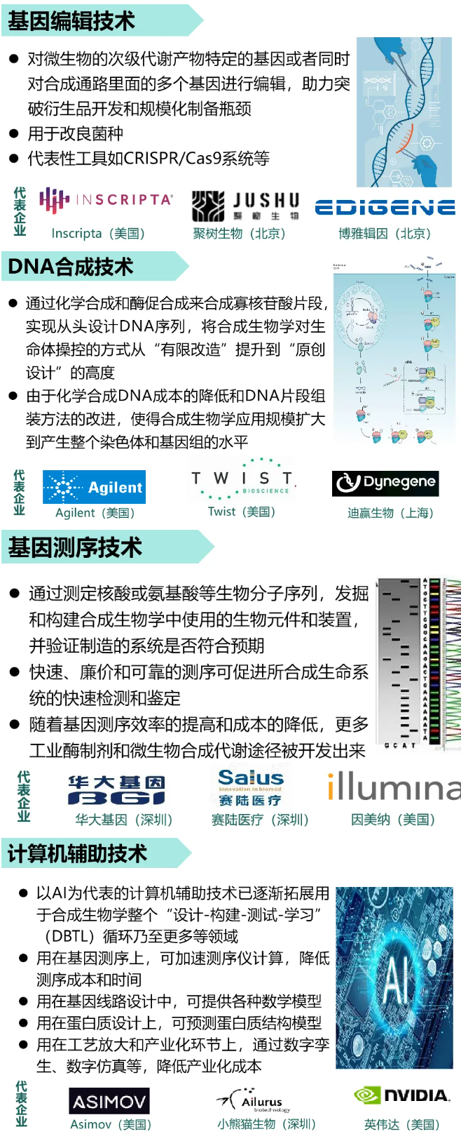 主要參與者是研發企業、高校院所等,負責開發合成生物學的底層技術并提供應用支持,一般不僅僅是服務于合成生物學領域。這類企業在短期內較難創造大規模營收,但對產業帶動作用強,一旦技術突破對行業可能帶來顛覆性影響。
