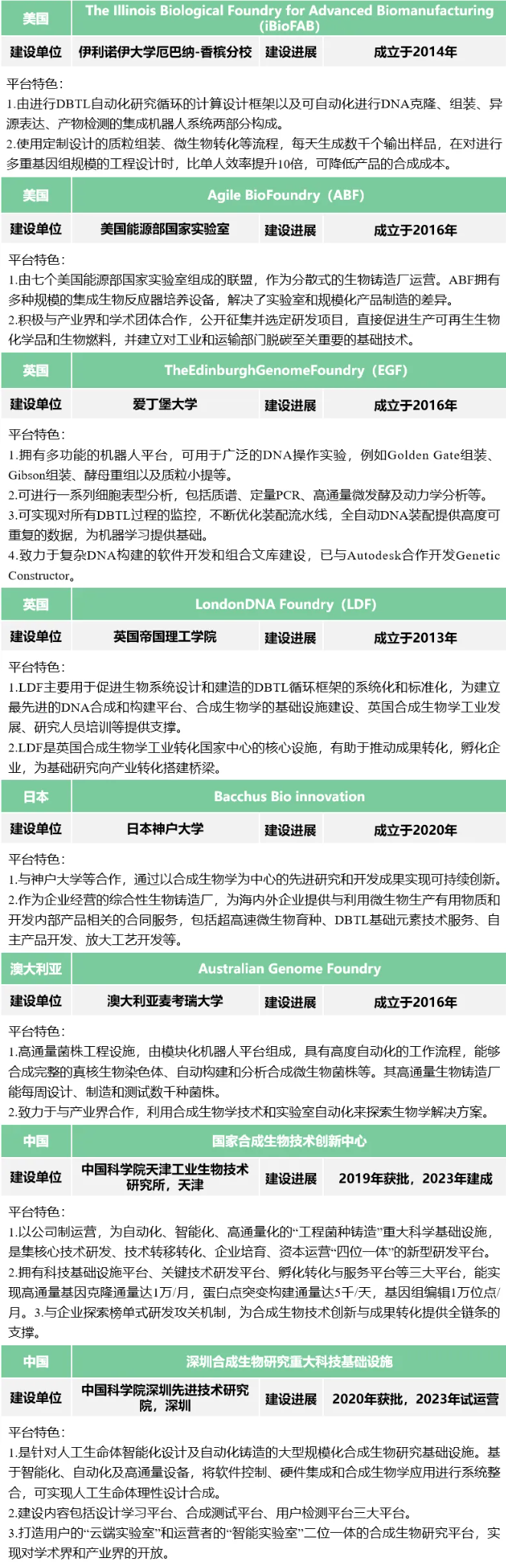 注:資料來自國際合成生物設施聯盟(Global Biofoundry Alliance,GBA)公開信息。該聯盟于2019年5月9日在日本成立,由美國勞倫斯伯克利國家實驗室、英國帝國理工學院、中國科學院深圳先進技術研究院等來自全球8個國家的16所頂尖合成生物設施機構聯合發起。截止2024年2月,共有35所成員單位,其中中國有5所。