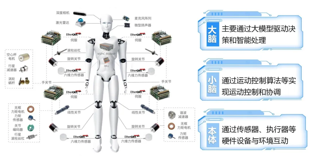 具身智能在架構上可以分為“大腦”“小腦”和“本體”。依托三者協同配合,機器人才能像人類一樣去面對各項需求,完成各類任務。其中,“大腦”主要通過大模型驅動決策和智能處理;“小腦”通過運動控制算法等實現運動控制和協調;“本體”通過傳感器、‌執行器、靈巧手等硬件設備實現與環境互動。
