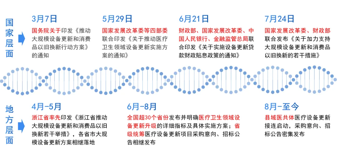 地方層面:2024年4月-5月,全國各省市落實國家政策要求,相繼發布大規模設備更新落地方案;6月-8月,醫療衛生領域設備更新升級方案及詳細指標落地,省級統籌采購意向相繼發布,采購金額從幾億元到幾十億元不等,其中廣東省采購金額高達54億元,北京各大市屬部屬醫院陸續發布采購公告;8月至今,縣域醫共體設備更新升級接連啟動,基層醫療機構迎來設備更新浪潮。