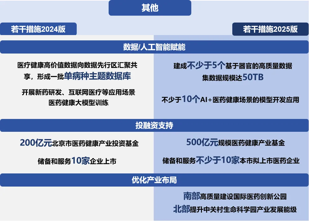 《若干措施2025版》為進一步加強對創(chuàng)新藥械研、產(chǎn)、審、用全鏈條政策支持,構建500億元規(guī)模醫(yī)藥健康產(chǎn)業(yè)基金加強投融資支持,包括新設100億元規(guī)模醫(yī)藥并購基金,發(fā)揮市級200億元、區(qū)級100億元兩級生物醫(yī)藥投資基金協(xié)同作用,帶動100億元規(guī)模社會基金,制定更包容、更體現(xiàn)創(chuàng)業(yè)友好型特征的相關制度,投早投小投長期,持續(xù)賦能創(chuàng)新藥、創(chuàng)新醫(yī)療器械高質(zhì)量發(fā)展。